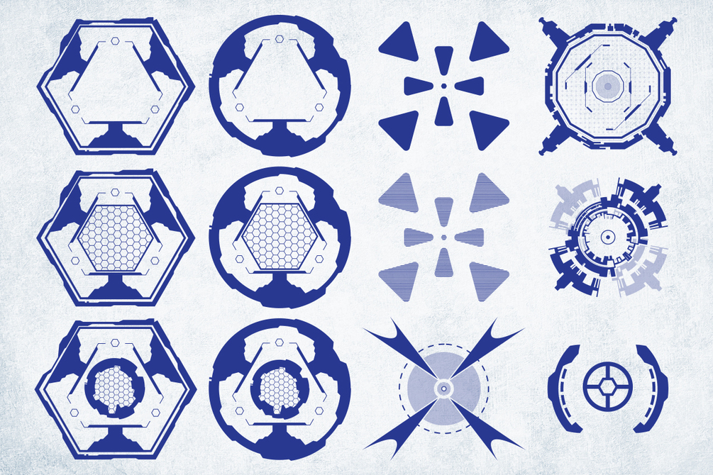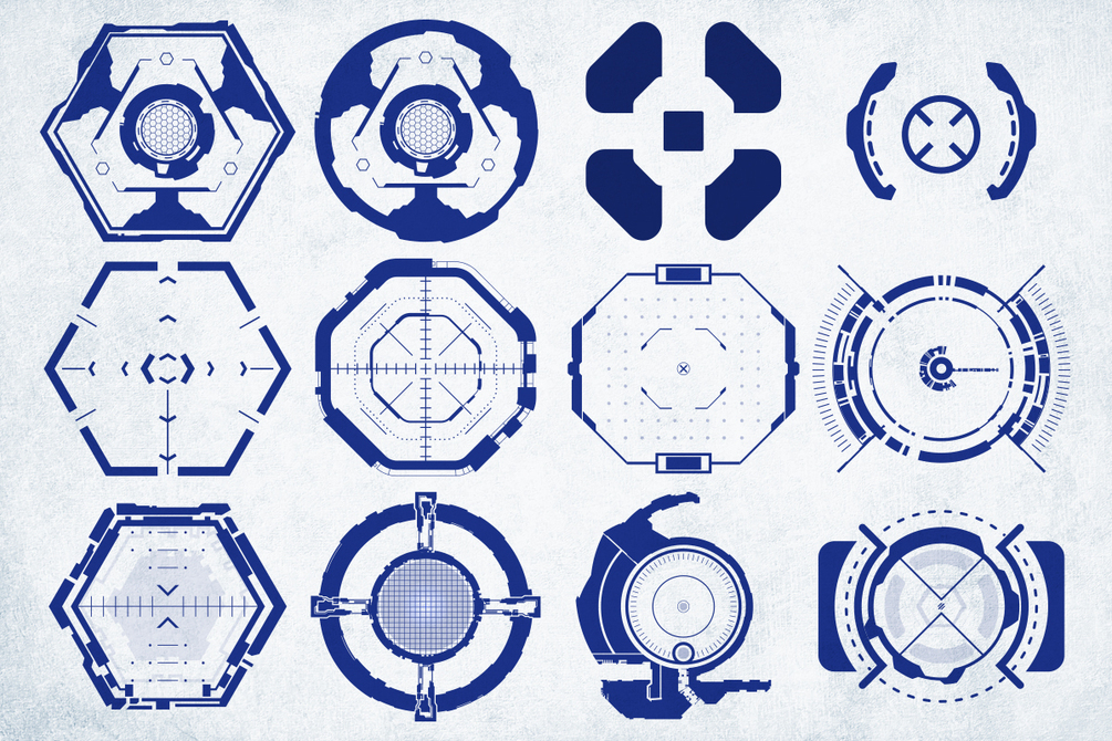 Lock on target with this collection of science-fiction gunsights and reticles, suitable for use in videogames, comics, and more.